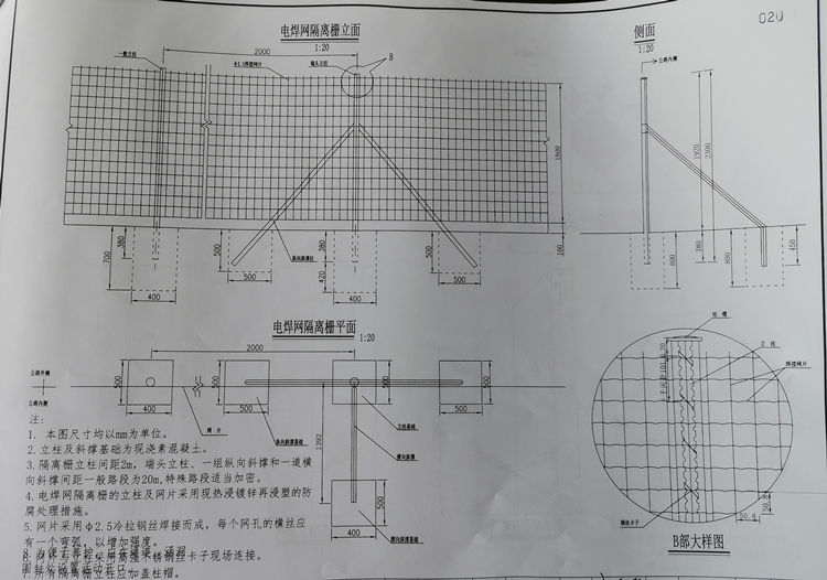 3、電焊網(wǎng)隔離柵立柱間距2m,端頭立柱、一組縱向斜撐和一道橫向斜撐間距一般路段為20m,特殊路段適當(dāng)加密。