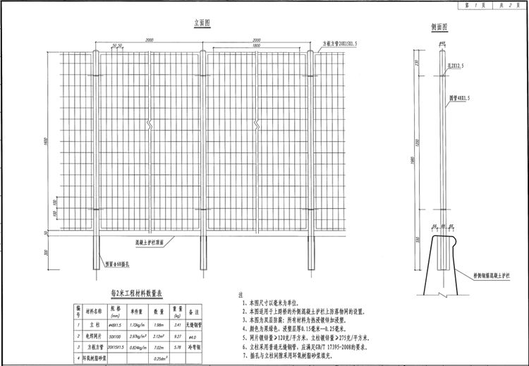 支線上跨橋外側(cè)混凝土護(hù)欄或梁柱式鋼護(hù)欄上均應(yīng)設(shè)置防落物網(wǎng),防落物網(wǎng)所有材料熱浸鍍鋅加浸塑,網(wǎng)片鍍鋅量120g/㎡,網(wǎng)片浸塑層厚度150μm,立柱鍍鋅量275g/㎡,立柱浸塑層厚度250μm。立柱采用普通無(wú)縫鋼管,混凝土護(hù)欄頂部預(yù)留立柱插孔,預(yù)留孔的垂直度偏差不超出1%,預(yù)留孔與立柱間隙采用環(huán)氧樹脂砂漿填充。同時(shí),防落物網(wǎng)應(yīng)做好防雷接地處理,接地電阻應(yīng)小于10Ω。