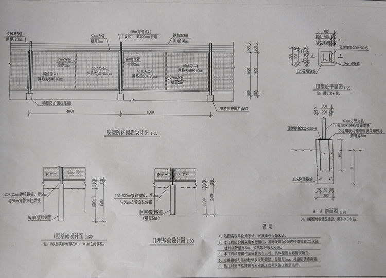 2、本工程水源地噴塑防護(hù)圍欄采用噴塑防護(hù)圍欄,基礎(chǔ)采用Dg100鍍鋅鋼管和C25現(xiàn)澆,鍍鋅鋼管壁厚5mm,砼抗凍等級(jí)為F150。