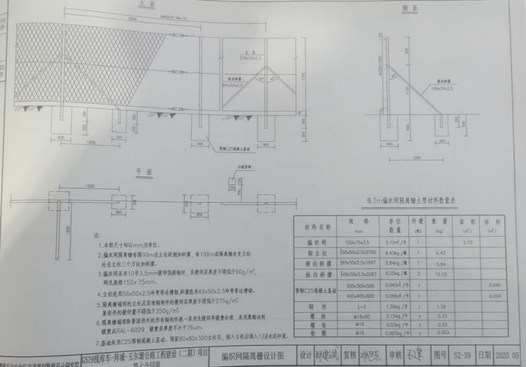 2.編織網(wǎng)隔離柵每隔99m在立柱兩側(cè)加斜撐,每198m或隔離柵改變方向處在立柱三個(gè)方向加斜撐。