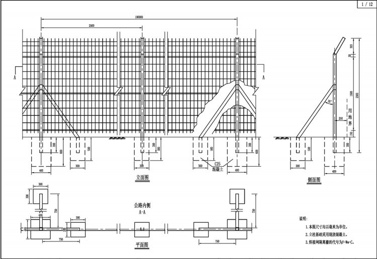 1.焊接網(wǎng)隔離柵沿公路用地界布置,立柱設(shè)置在用地界內(nèi)側(cè)25厘米處。