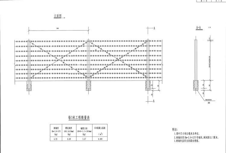 鍍鋅刺鋼絲隔離柵立柱采用φ48X1.5mm焊接鋼管,間距為3m,高出地面1.55m,剌鋼絲采用Bw-2.8-127號(hào),剌間距127mm。網(wǎng)眼寬度50X50mm,刺尖高25.4mm應(yīng)置于刺鋼絲中,網(wǎng)片由冷拉鋼絲點(diǎn)焊而成。表面先熱浸鍍鋅,后浸塑而成。隔離柵鋼構(gòu)件采用技術(shù)條件應(yīng)符合《碳素結(jié)構(gòu)鋼技術(shù)條件》(GB700-88)之規(guī)定,立柱均應(yīng)加蓋柱帽,里外熱浸鍍鋅,后表層噴塑而成。鋼構(gòu)件、刺鐵絲均應(yīng)做熱浸鍍鋅浸塑防腐處理,鍍鋅時(shí)應(yīng)符合《公路交通工程鋼構(gòu)件防腐技術(shù)條件》(GB/T 18226-2015) 之規(guī)定。顏色采用果綠色,色號(hào)可采用6012或6010。刺鋼絲隔離柵的立柱、基礎(chǔ)用于混凝土的水泥、沙石等材料,應(yīng)滿足現(xiàn)行交通行業(yè)標(biāo)準(zhǔn)《公路鋼筋混凝土及預(yù)應(yīng)力混凝土橋涵設(shè)計(jì)規(guī)范》(JTGD62-2012)中有關(guān)規(guī)定。如有未盡事宜,均按《公路交通安全設(shè)施設(shè)計(jì)細(xì)則》(JTG/T D81-2017)、 《高速公路交通工程及沿線設(shè)施設(shè)計(jì)通用規(guī)范》(JTG080-2006)、《公路交通安全設(shè)施設(shè)計(jì)規(guī)范》(JTGD81-2017)、《道路交通標(biāo)志和標(biāo)線》(GB5768-2009)、《 公路交通標(biāo)志反光膜》(GB/T18833-2012)、《公路交通標(biāo)志和標(biāo)線設(shè)置規(guī)范》(JTG D82-2009)以及《國(guó)家高速公路網(wǎng)命名和編號(hào)規(guī)則》(JTG A03-2007)和《國(guó)家公路網(wǎng)交通標(biāo)志調(diào)整工作技術(shù)指南》的有關(guān)規(guī)定執(zhí)行。
