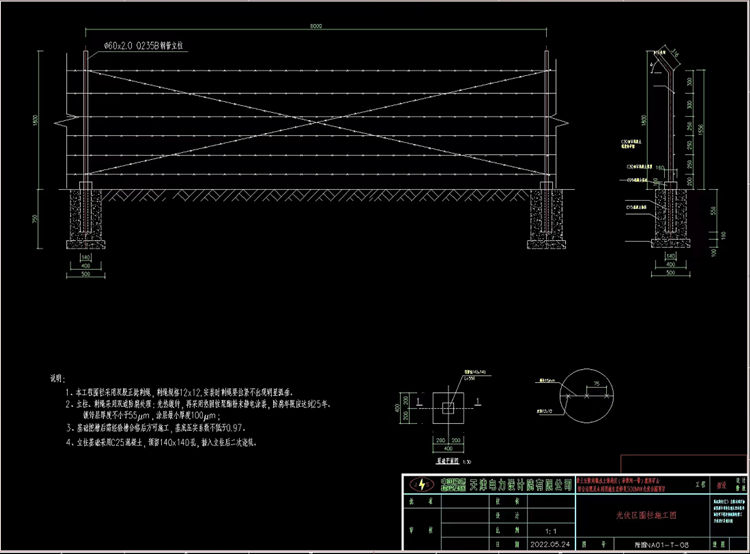 2、立柱、刺繩采用雙道防腐處理。先熱鍍鋅,再采用熱固性聚酯粉末靜電涂裝,防腐年限應(yīng)達(dá)到25年。鍍鋅層厚度不小于55微米,涂層不小于100微米。