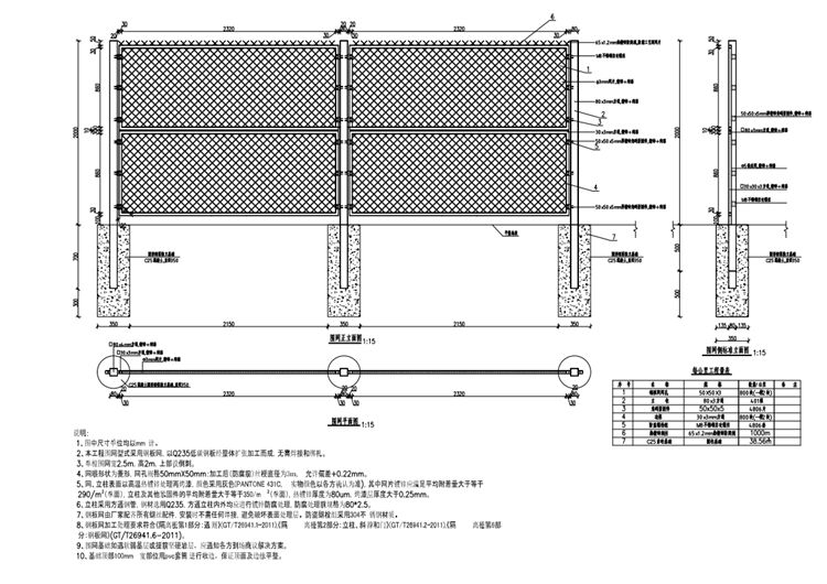 5、網(wǎng)、立柱表面以高溫?zé)徨冧\處理再烤漆,顏色采用灰色(PANTONE 431C,實(shí)物顏色以各方確認(rèn)為準(zhǔn)),其中網(wǎng)片鍍鋅應(yīng)滿足平均附著量大于等于290/㎡(單面),立柱及其他緊固件的平均附著量大于等于350/㎡(單面), 熱鍍鋅厚度為80um,烤漆層厚度大于0.25mm。