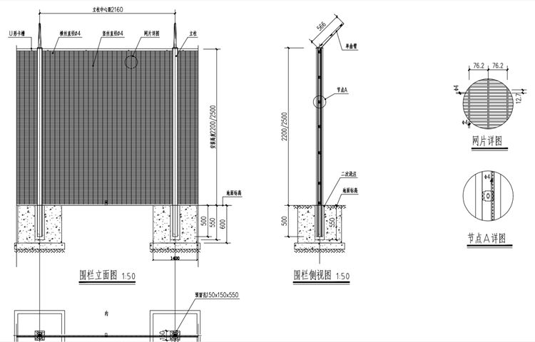 6.圍欄立柱中心距為2160,安裝高度為2500, 網(wǎng)格76.2x12.7。
