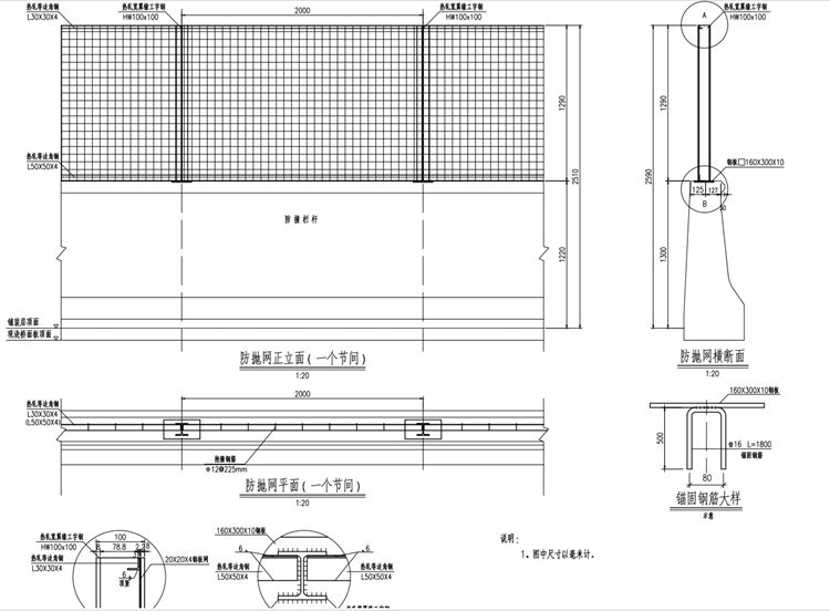 13.本圖數(shù)量表中數(shù)量按柵欄一個節(jié)間2米考慮,未計損耗,防拋網(wǎng)設(shè)置范圍為:第1~第3跨,順橋向單側(cè)長度120m。