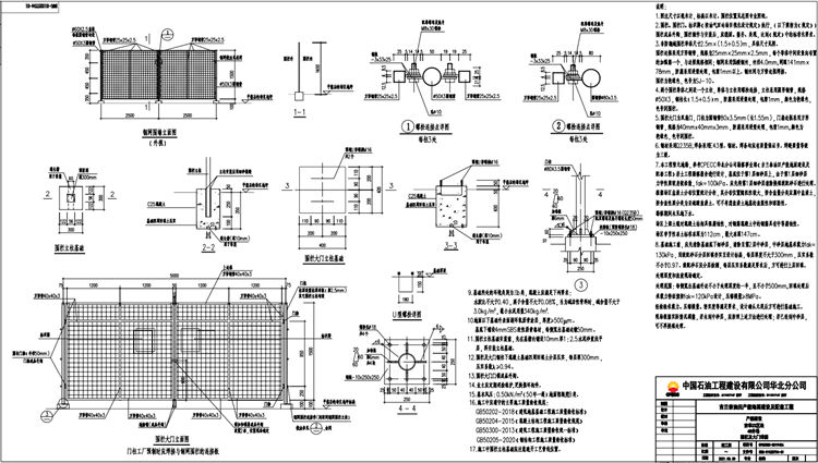 2.井場(chǎng)圍欄、圍欄門(mén)、標(biāo)識(shí)牌《按油氣田站場(chǎng)目視化設(shè)計(jì)規(guī)定》執(zhí)行, (以下簡(jiǎn)稱為《規(guī)定》)。圍欄成品外購(gòu),圍欄制作與安裝后,應(yīng)穩(wěn)固、整齊、美觀,達(dá)到《規(guī)定》中的標(biāo)準(zhǔn)化要求。