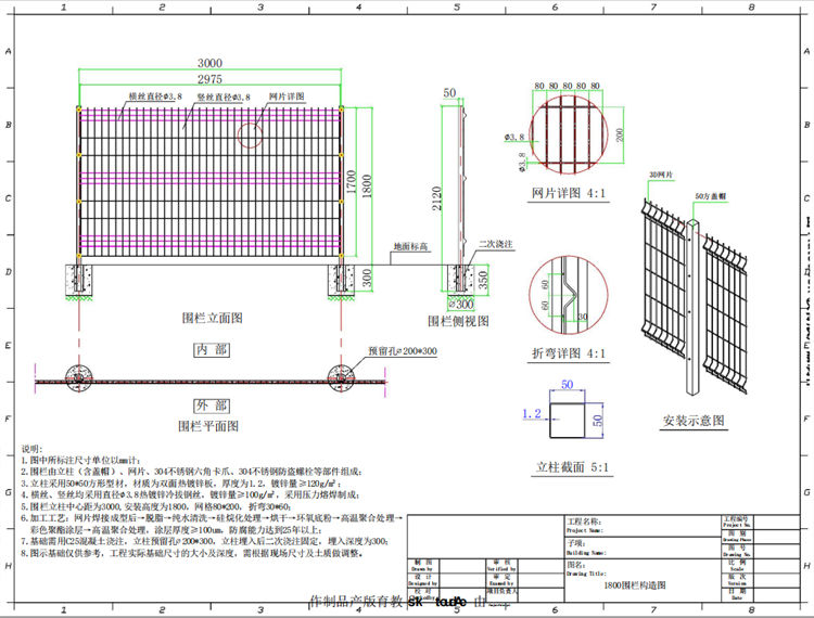 5.圍欄立柱中心距為3000,安裝高度為1800,網(wǎng)格80*200,折彎30*60;