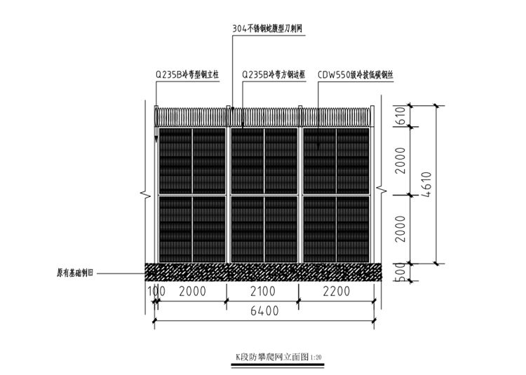 立柱材質(zhì)為Q235B冷彎型鋼,邊長(zhǎng)100mm,壁厚4mm,間距2000mm;邊框材質(zhì)為Q235B冷彎方鋼,邊長(zhǎng)50mm,壁厚2mm;鋼絲焊接網(wǎng)材質(zhì)為CDW550冷拔低碳鋼絲,網(wǎng)孔間距橫向?yàn)?00mm,豎向間距為