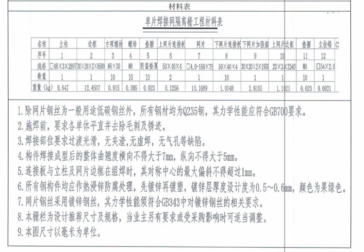 1.除網片鋼絲為一般用途低碳鋼絲外,所有鋼材均為Q235鋼,其力學性能應符合GB700要求。