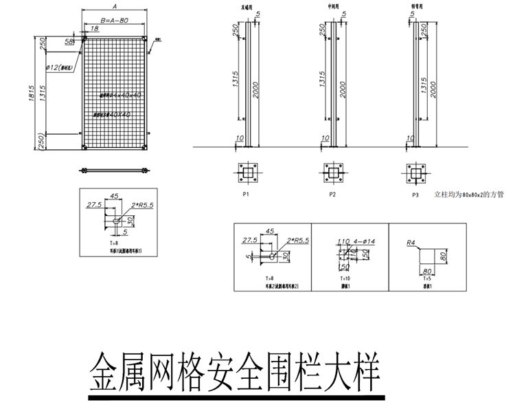 1.安全圍欄立柱均為80x80x2,網(wǎng)框40厚,圍欄網(wǎng)鐵絲直徑4mm,網(wǎng)格大小40x40,安全圍欄立柱底板尺寸200x200x10m,立柱間距1500mm,不足之處按現(xiàn)場實際情況調(diào)整。