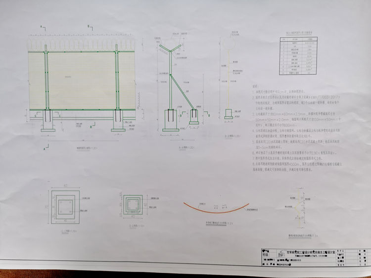 3.立柱截面尺寸為80mmx60mmx2.5mm,斜撐和延伸臂截面尺寸為50mmx50mmx2.0mm,鋼筋網片網格尺寸為100mmx50mm (中到中),刺刀圈直徑不小于600mm。
