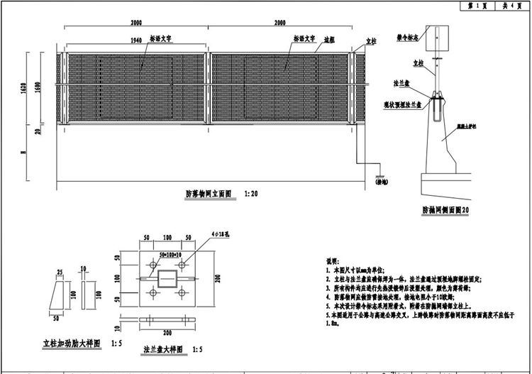 6.本圖適用于公路與高速公路交叉,上跨鐵路時(shí)防落物網(wǎng)距離路面高度不應(yīng)低于1.8m。