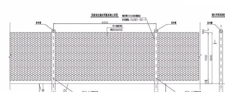 1、低碳鋼絲編織網(wǎng)隔離柵立柱采用Φ75*1.5mm圓管,基礎(chǔ)采用C25混凝土。