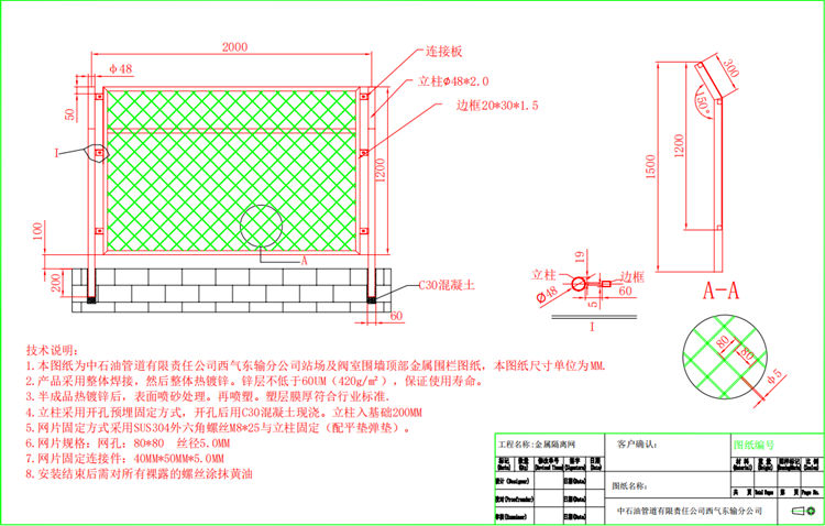 1.本圖紙為中石油管道有限責(zé)任公司西氣東輸分公司站場(chǎng)及閥室圍墻頂部邊框式金屬圍欄圖紙,本圖紙尺寸單位為MM。