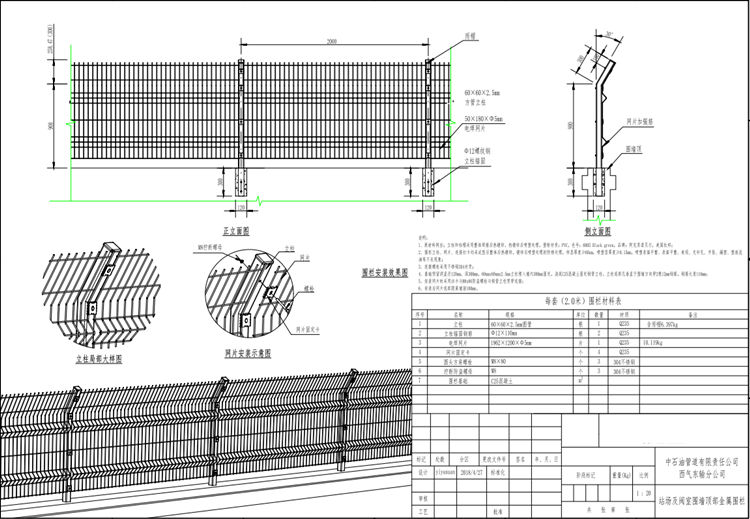5、金屬防護(hù)欄安裝網(wǎng)片時采用扣卡與M8x80防盜螺栓與鋼管立柱貫穿連接。