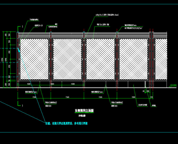 (3)圍網(wǎng)立柱間距1.5m,采用電焊管其化學(xué)成分及機(jī)械性能應(yīng)符合有關(guān)規(guī)定,焊接部位要求過度圓滑,無夾縫,無虛焊,無氣孔等缺陷。