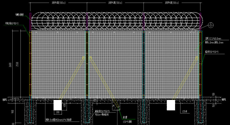 (1)、本項(xiàng)設(shè)計(jì)采用成品鋼絲網(wǎng)圍墻,成品鋼絲網(wǎng)圍墻由端柱、中間柱、轉(zhuǎn)角柱、加強(qiáng)柱、網(wǎng)片、頂部延伸臂+刺絲+刺刀圈等組成,。圖中所標(biāo)注尺寸為中心線尺寸,單位為mm計(jì)。