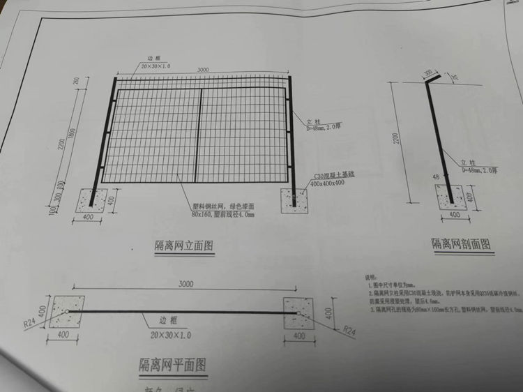 5、鋼絲網(wǎng)防護網(wǎng)立柱外徑48mm,塑前厚度2.0mm,立柱預(yù)埋水泥墩里面300mm。