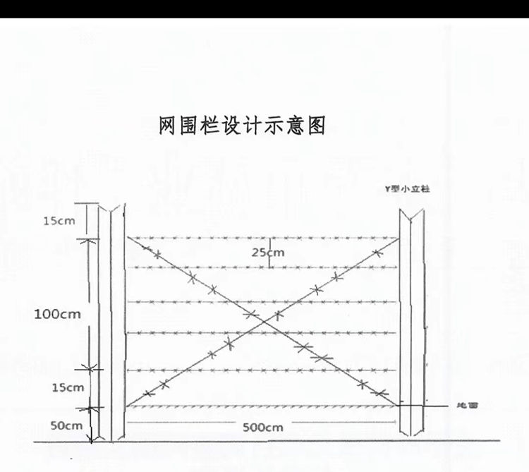 2、鍍鋅刺鐵絲防護(hù)欄使用七道刺絲(刺絲規(guī)格為帶刺雙絲合一,鍍鋅鐵絲,單絲2.4mm,雙絲4.8mm),其中五道橫絲,兩道X絲。刺間距小于6cm。 (見鍍鋅刺鐵絲防護(hù)欄設(shè)計(jì)示意圖)