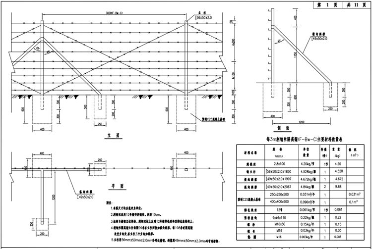 5.帶刺鋼絲防護(hù)網(wǎng)立柱采用56×50×2.0×1850mm槽鋼,斜撐選用49X50X2.5冷彎等邊槽鋼。帶刺鋼絲防護(hù)網(wǎng)熱鍍鋅噴塑防腐處理,鋼構(gòu)件鍍鋅量為 275g/㎡,涂塑層厚度大于76μm。立柱安裝間距設(shè)置為3m。刺鋼絲采用12號鍍鋅鋼絲,刺鋼絲鍍鋅量為 120g/㎡。刺絲間距4×15+4×20。基礎(chǔ)混凝土為C30,尺寸400×400×600。按新規(guī)范增加帶刺鋼絲防護(hù)網(wǎng)小門。