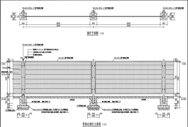 1.防護(hù)圍欄立柱為80mm*80mm*1850mm,2.5mm厚方鋼管;防護(hù)圍欄基礎(chǔ)為預(yù)制混凝土,混凝土等級(jí)為C20 ,規(guī)格400mm*400mm*400mm。防護(hù)圍欄基礎(chǔ)中心預(yù)留180mm米180mm鋼管插孔,鋼管深入混凝土基礎(chǔ)300mm , 待安裝好再用細(xì)石混凝土(混凝土等級(jí)為C20 )填實(shí)縫隙。