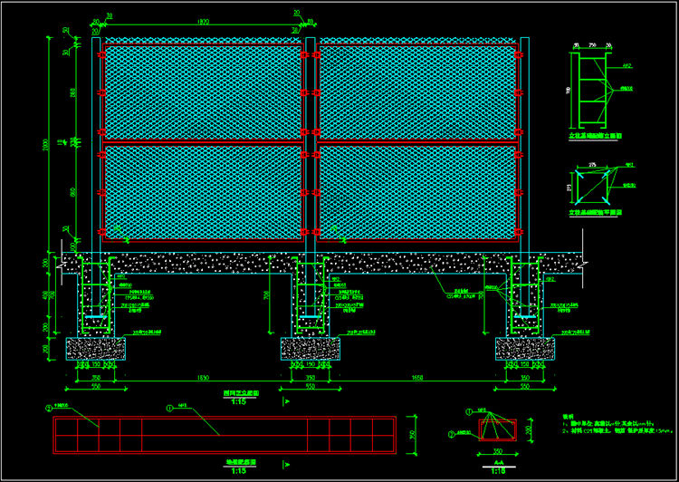 5、在護欄防護網(wǎng)底部設(shè)地梁,寬350mm( 包合立柱基礎(chǔ)寬度)。如遇基巖軟弱基層或提前堅硬巖層,應(yīng)通知各方到場商議解決方案。