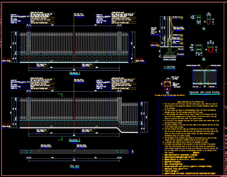 圍墻長度及定位詳總圖,拐角部位必設(shè)磚柱,并對(duì)磚柱間隔作相應(yīng)均分調(diào)整。鐵藝欄桿根據(jù)磚柱間距作對(duì)應(yīng)調(diào)整。