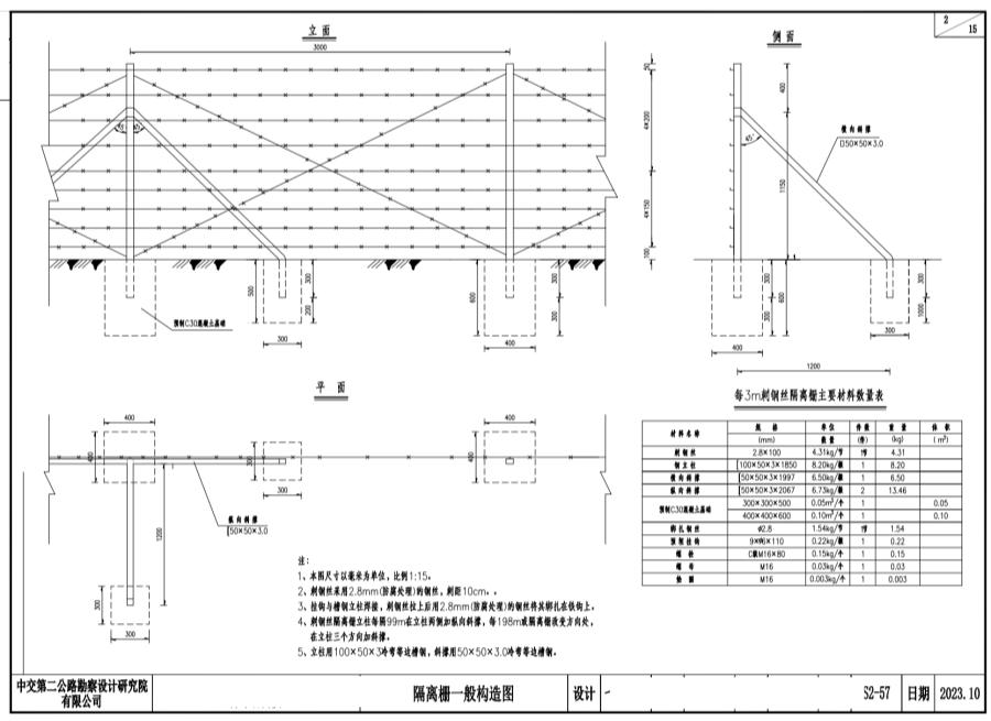 4、刺鋼絲隔離柵立柱每隔99m在立柱兩側(cè)加縱向斜撐,每198m或隔離柵改變方向處在立柱三個方向加斜撐。