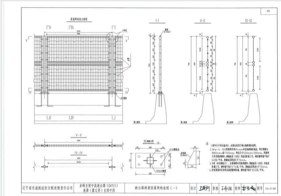 1.圖中尺寸均以毫米計(jì),本圖適用于跨公路橋梁防落網(wǎng)。