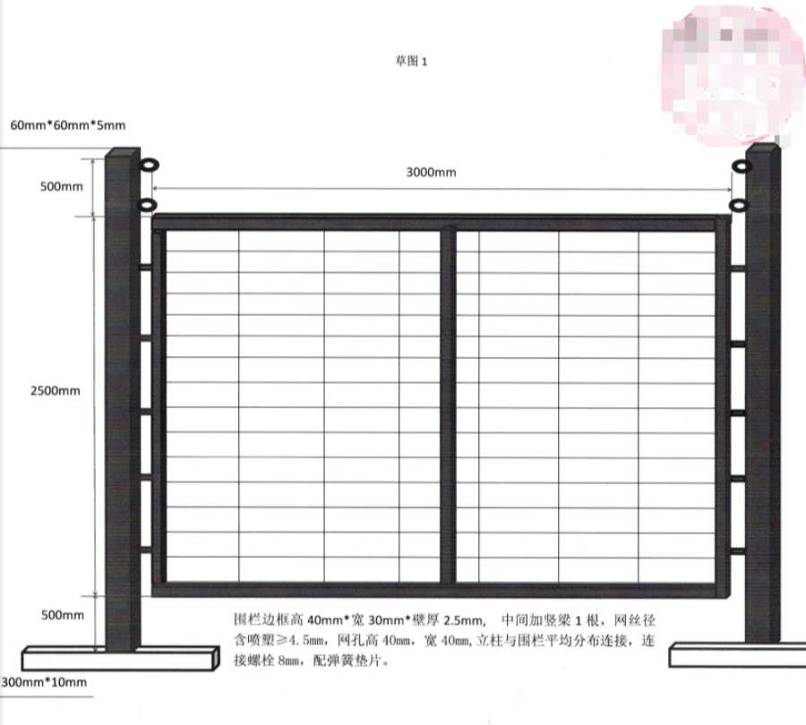 2.活動(dòng)圍欄具體規(guī)格3000mmX2500mm(寬1500mm 處加裝豎梁一根),圍欄孔徑40mmX40mm,鋼絲噴塑后不小于4.5mm,圍欄四周方鋼邊框尺寸為 30mmX40mmX2.5mm(40mm 為邊框正面高度)。(見草圖 1)