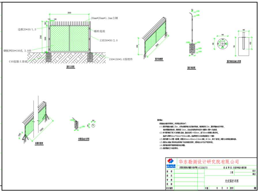 (1)圍欄頂端高出地面2.35m,主要由熱鍍鋅鋼立柱及鋼網構成,鋼立柱跨度約3.0m,圍欄頂端向站區(qū)外彎折,鋼絲網需做浸塑處理,浸塑厚度1.5mm,其余未作說明材料均采用“熱鍍鋅+ 浸塑”方法防腐。