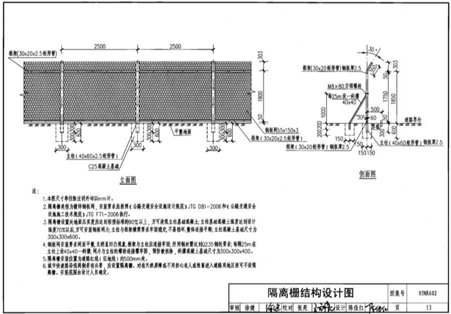 2.隔離柵類型為鍍鋅鋼板網(wǎng),安裝要求應(yīng)按照《公路交通安全設(shè)施設(shè)計規(guī)范》JTG D81-2006和《公路交通安全設(shè)施施工技術(shù)規(guī)范》JTG F71-2006執(zhí)行。
