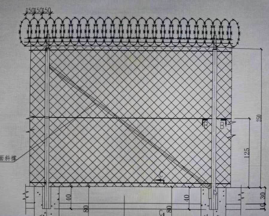 8、圖中圍界總高度為3.0m,立柱間距為30m,為確保圍界安置后的穩(wěn)固,要求每2個立柱設(shè)一道斜撐,轉(zhuǎn)折處每個立柱設(shè)一道斜撐。